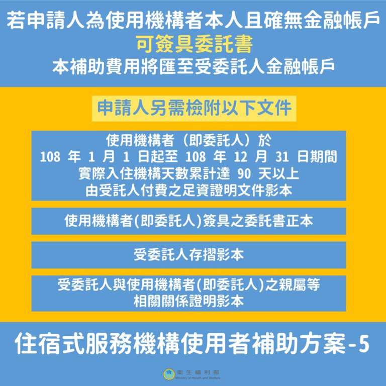 每年申請時間皆不同,建議至衛福部網站查詢,今年住宿式服務機構使用者補助方案申請時間,為民國109年1月15日至02月15日止,僅補助民國108年的長照機構住宿費用,申請人可以向最近一次入住機構的所在直轄縣市公所申請。